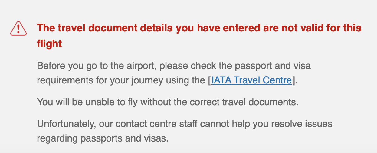 Now that the multi-country registrations were done, I could finally go to check-in online and get the boarding passes. My wife and I share the same nationality, place of residence, same place of living, and same travels in the past 6 months at least. And since I booked a ticket for two, we also share the same destination. I managed to get my boarding pass in a relatively easy way. But I could not get hers. The intimidating message in red bold was all I could get. With a helpful "You will be unable to fly without the correct travel documents." And another very helpful "Unfortunately, we cannot help you resolve issues regarding passports and visas".