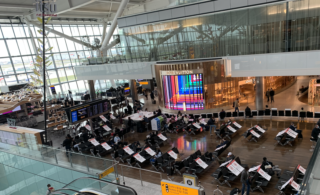 This is where we are allowed to venture inside, and discover what the largest airport in the UK looks like during Covid. Going through the baggage screening was nearly a better experience than in the past, since there were many lines open and not too many people queueing, so we went through this fairly quickly.
