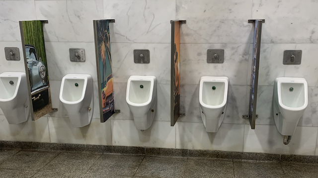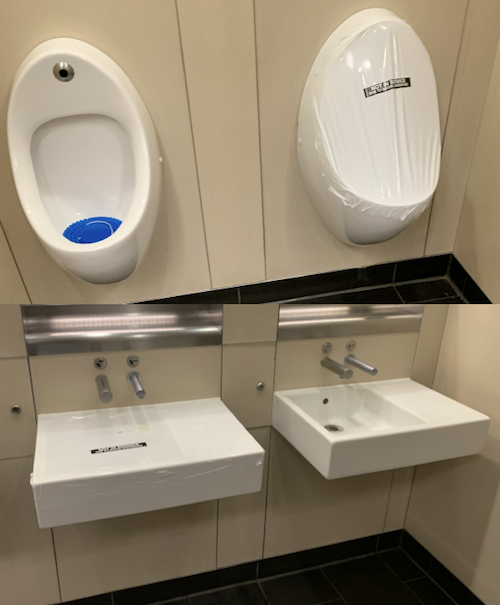 What next? I am sure that you want to know what the male toilet experience is, so here it is in plain sight... One out of two of those urinals are covid-blocked, so that you do not pee too close to each other. Even the wash basins are covid-blocked too, one out of two.